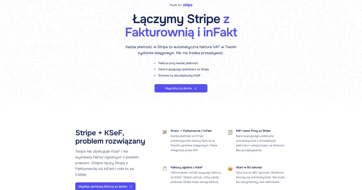 Stripto is a specialized integration tool that automatically connects Stripe payment processing with Polish accounting systems to generate KSeF-compliant invoices. Designed for Polish businesses using Stripe for online payments, it eliminates manual invoice creation by automating the entire process from payment to tax-compliant documentation.