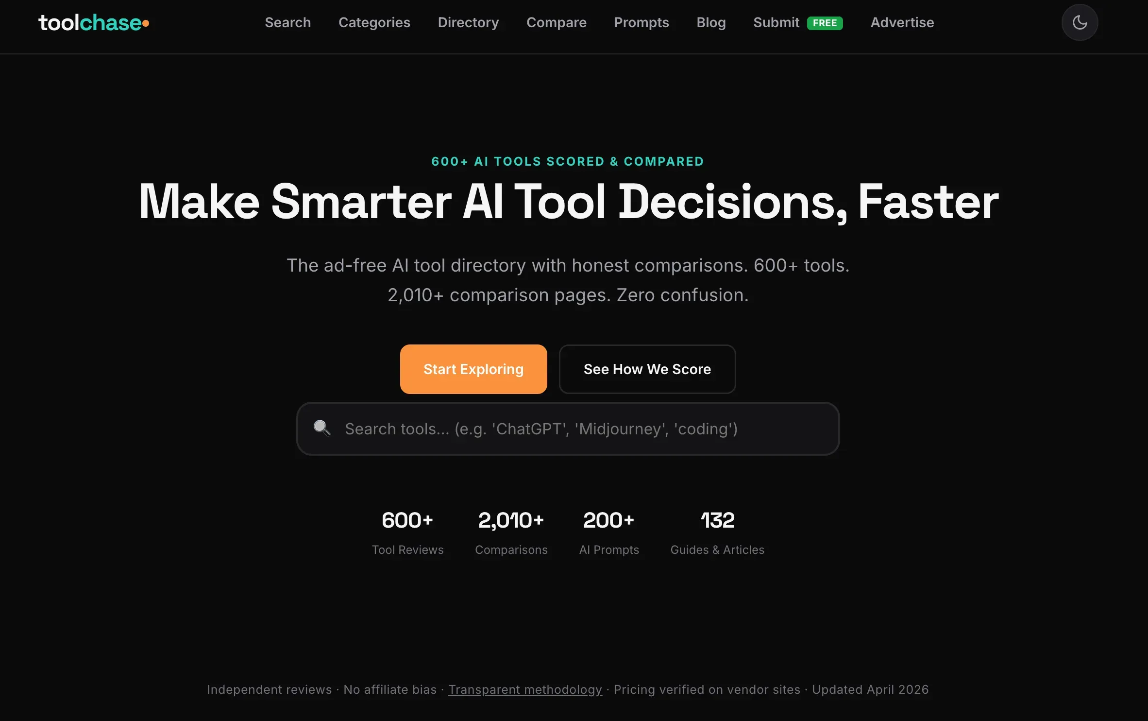 ToolChase is an ad-free AI tool directory that helps users discover, compare, and choose the best AI tools for their needs. With over 600 tools reviewed, 2,010+ comparison pages, and a transparent scoring methodology, ToolChase provides honest, unbiased information without affiliate bias.